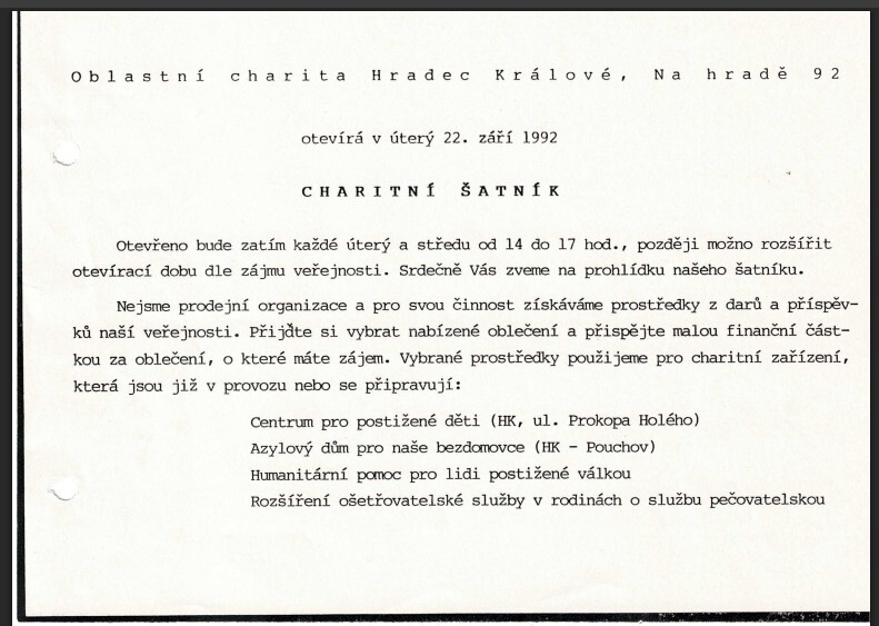 Sociální šatník Oblastní charity Hradec Králové obléká potřebné již od začátků existence organizace. Tehdy, před více jak třiceti lety stála u zrodu myšlenky využití použitého textilu a darování potřebným parta dobrovolníků.