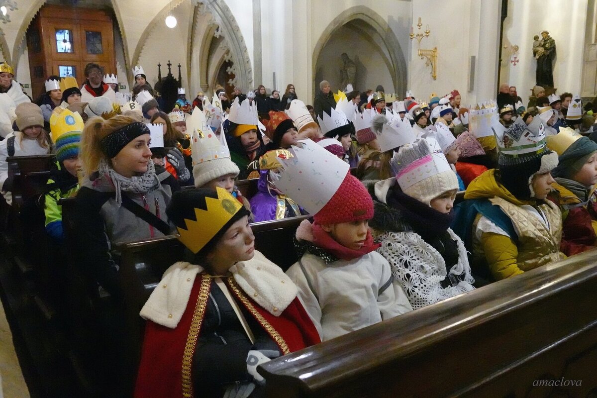 Desítky koledníků se sešly po osmé hodině již v katedrále svatého Ducha, kde jim požehnal královéhradecký biskup Jan Vokál. Tradicí bývá také požehnání bílých i barevných kříd, kterými koledníci píši symboly K+M+B vždy v následujícím roce.