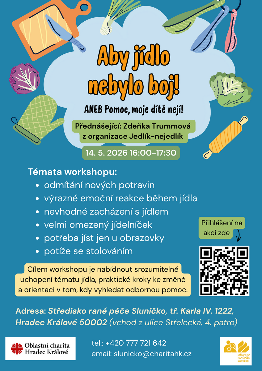 Středisko rané péče Sluníčko Vás srdečně zve na workshop – „Aby jídlo nebylo boj ANEB Pomoc, moje dítě nejí!“, který se uskuteční 14. 5. 2026 od 16:00 – 17:30h. ve Středisku rané péče Sluníčko, na adrese tř. Karla IV. 1222, Hradec Králové 500 02.